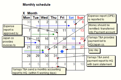 毎月一定の日までに従業員の前月分の立替経費の精算書を本国のコントローラーに承認してもらいます。その他給料や家賃等の請求書にしたがい、その月の必要経費をExcel形式で一覧表にまとめ、コントローラーに報告します。